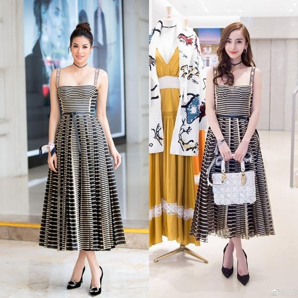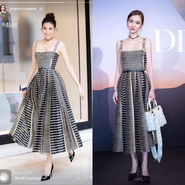 Cả 2 đều pose 1 dáng vắt chéo chân, cùng chọn phụ kiện đen gồm chocker mảnh, giày cao gót, thắt lưng nhưng Phạm Hương mix thêm khăn ở cổ tay còn Angela Baby là chiếc túi Dior trắng. Với kiểu tóc này, nàng hậu Việt Nam thì "hack tuổi" còn nàng diễn viên Trung Quốc thì lại dịu dàng, duyên dáng.
