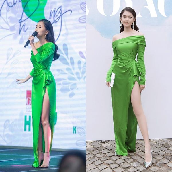 Quả thật khó để phân định ai mặc đẹp hơn ai. Cả Thùy Dung và Bích Phương đều mảnh mai, xinh đẹp, đôi chân thon dài không tỳ vết và "vòng nào ra vòng nấy" trong đầm xẻ tà của NTK Lê Thanh Hòa. Màu xanh lá tưởng chừng khó mặc đến đâu cũng đẹp tuốt!