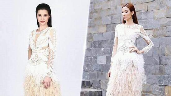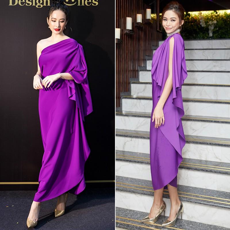 Với trường hợp này, đụng váy, đụng ý tưởng phụ kiện màu gold sang chảnh, đụng cả kiểu tóc búi cao nhưng Mâu Thủy lại có thêm vòng trai 3 tầng ở cổ trong khi Angela Phương Trinh lại biết cách cân bằng hơn, không để bộ đầm nuốt dáng.