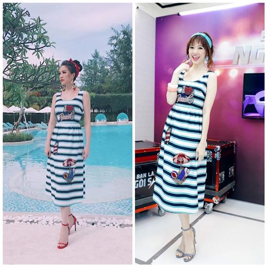 Bảo Thy và Hari Won dạo này trùng sóng phong cách đến lạ. Mẫu đầm casual kẻ ngang có các chi tiết cực kỳ mùa hè được 2 nữ ca sĩ phối với giày cao gót quai mảnh, turban và khuyên tai "ton sur ton".