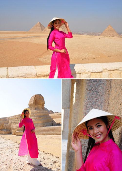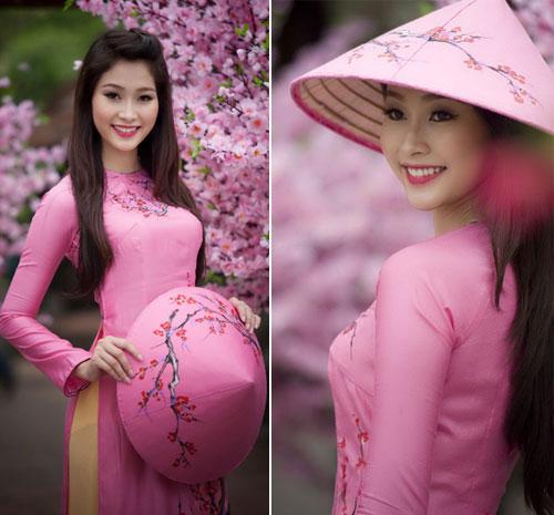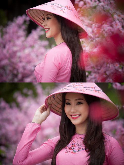 Hoa Hậu Thu Thảo nét như tranh vẽ nhờ chiếc áo dài hồng, nón lá hồng.