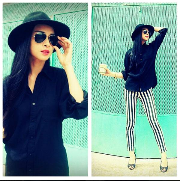 Ngô Thanh Vân kết hợp quần kẻ sọc với áo sơ mi thụng cùng giày cao gót, mũ và kính