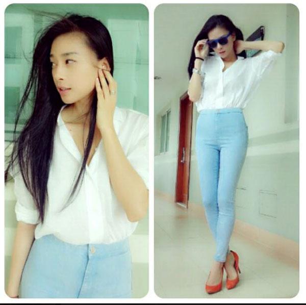 Sơ mi trắng phối cùng quần skinny màu xanh nhã nhặn cũng là style được người đẹp rất