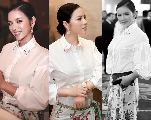 Khi tham gia một sự kiện quốc tế, Lý Nhã Kỳ vẫn chọn cho mình áo sơ mi trắng cùng áo