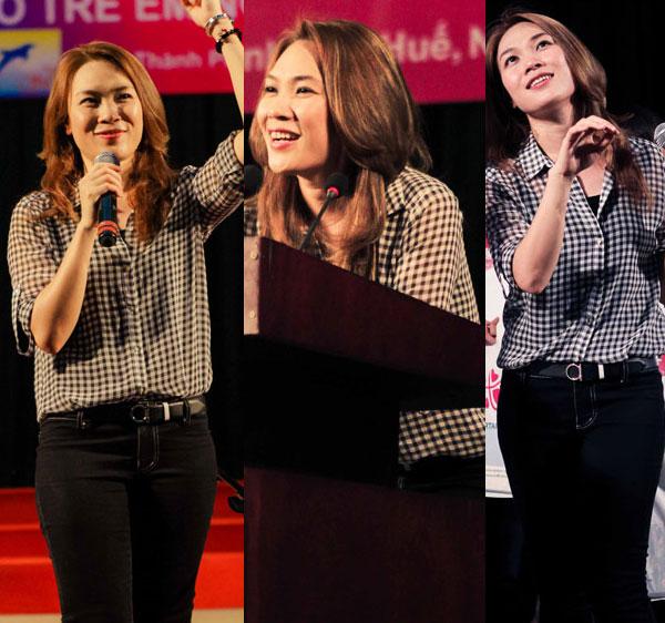 Mỹ Tâm trẻ trung và nhí nhảnh với quần jeans đen, áo kẻ caro trên sân khấu.