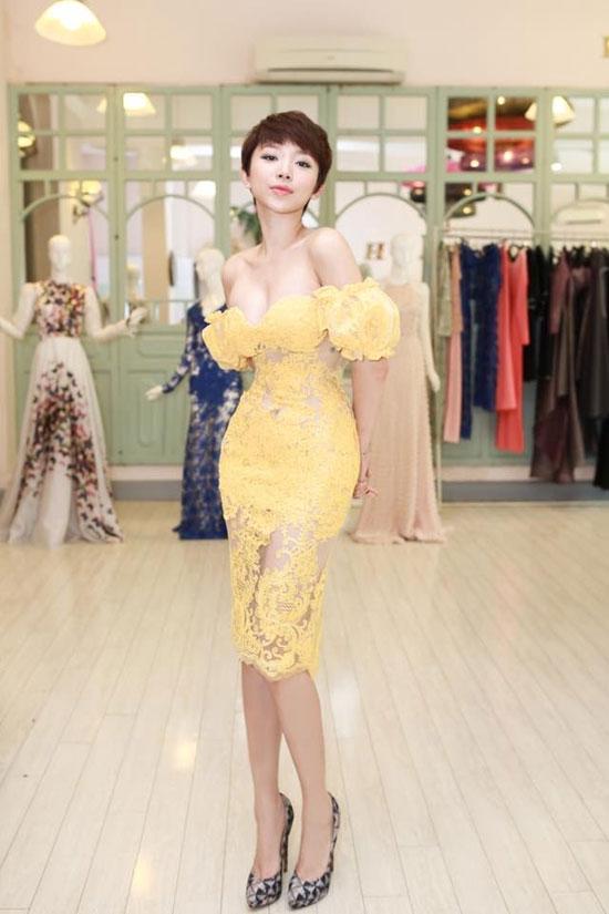 Chiếc váy ren cúp ngực màu vàng nhạt, cùng điểm nhấn là đôi tay áo phồng trễ vai khá tinh tế là một sự lựa chọn sáng suốt của Tóc Tiên khi muốn phô diễn vẻ gợi cảm của mình