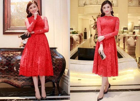 Á hậu Huyền My vừa thanh lịch, vừa gợi cảm trong chiếc váy ren tông đỏ của nhà thiết kế Đỗ Mạnh Cường