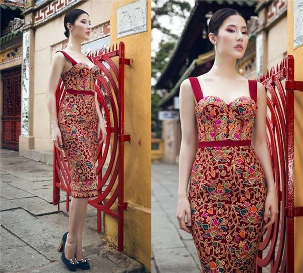 Bộ váy cúp ngực hiện đại của Ngọc Trinh được tạo điểm nhấn thú vị bằng hình ảnh hoài cổ gắn liền với làng quê Việt Nam.