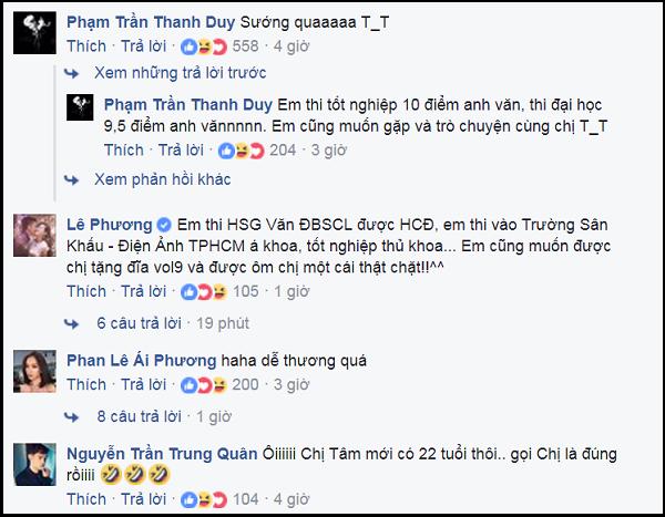 Không kém cạnh Thanh Duy, diễn viên Lê Phương cũng tranh thủ "đòi quà" đàn chị: "Em thi Học sinh giỏi Văn Đòng bằng Sông Cửu Long được Huy chương đồng. Em thi vào Trường Sân khấu - Điện ảnh TP HCM với thành tích Á khoa, tốt nghiệp Thủ khoa. Em cũng muốn được chị tặng đĩa và được ôm chị một cái thật chặt".