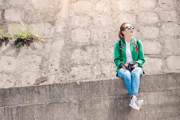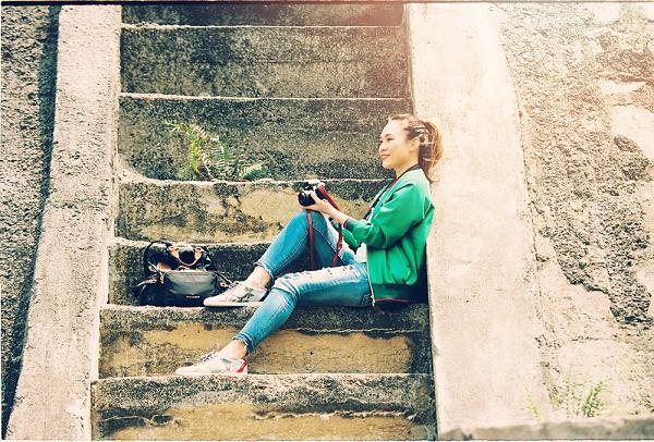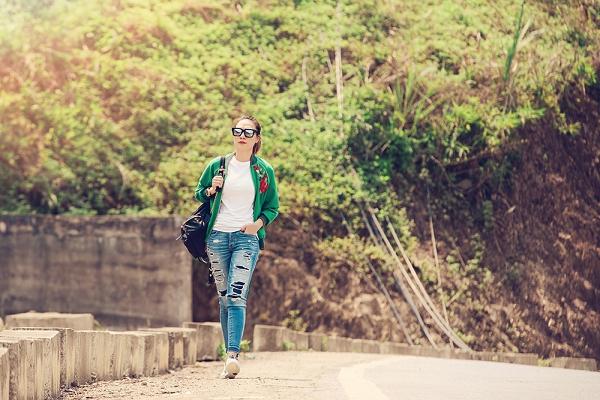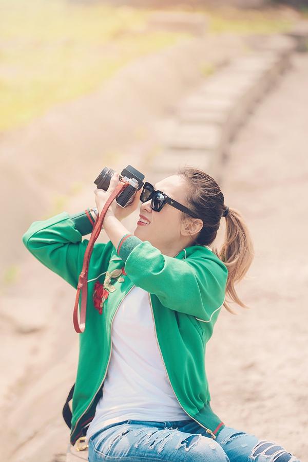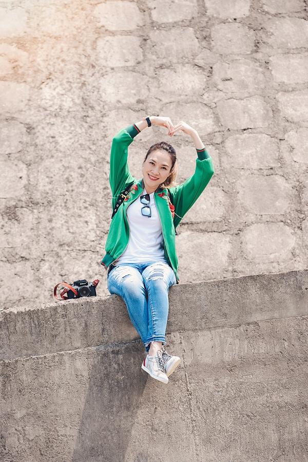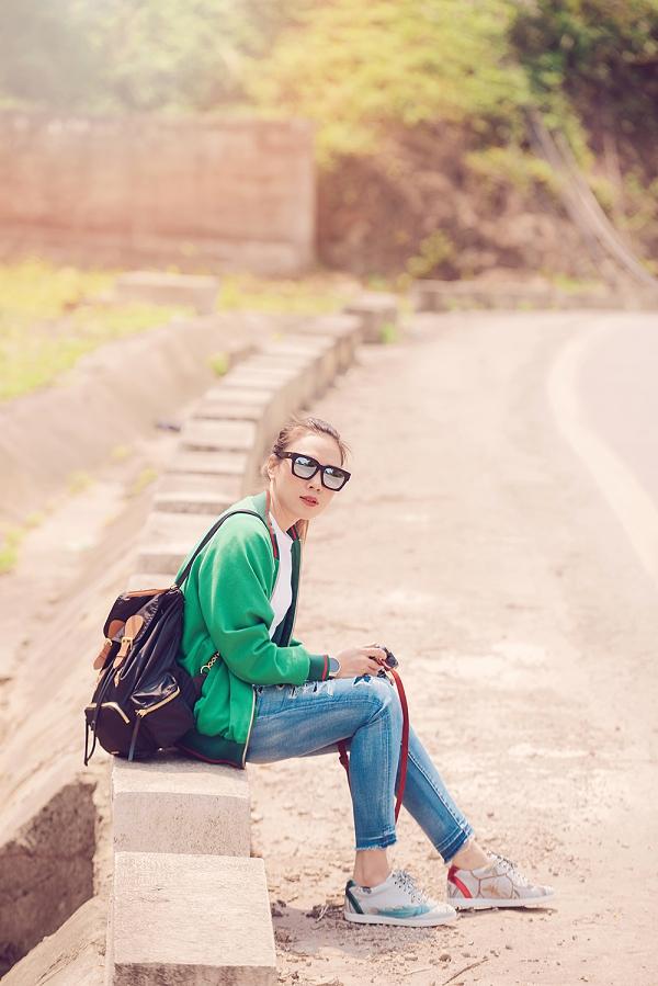 Diện áo thun quần jeans rách cá tính kết hợp với áo khoác bomber, nữ ca sĩ đến thăm những nơi nổi tiếng từng được giới trẻ yêu thích. Ngoài ra, kính mát đen cùng giày sneaker hoạ tiết nổi bật giúp cô khoe vẻ trẻ trung giữa thiên nhiên. Phong cách năng động được Mỹ Tâm ưu tiên chọn lựa trong những lần xuất hiện tại nơi công cộng.