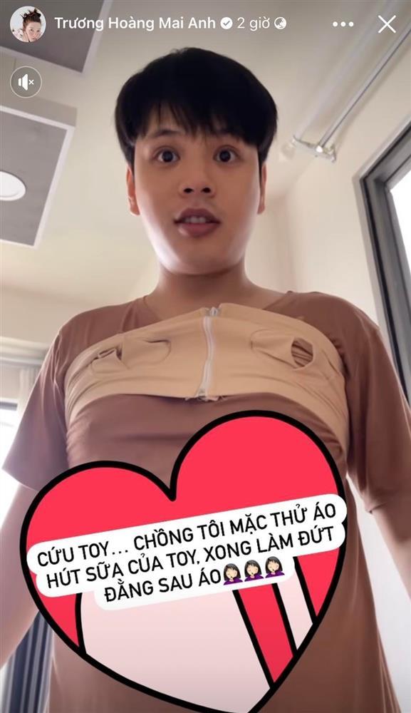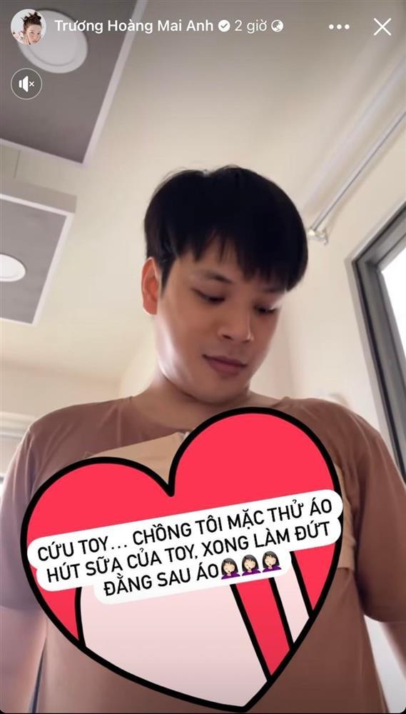 Trên story Facebook, tối 5/8 Trương Hoàng Mai Anh hào hứng chia sẻ hình ảnh về Jaykii. Đó là khoảnh khắc lầy lội ghi lại cảnh nam ca sĩ mặc thử áo hút sữa của vợ, kết quả làm đứt cả đằng sau áo.
