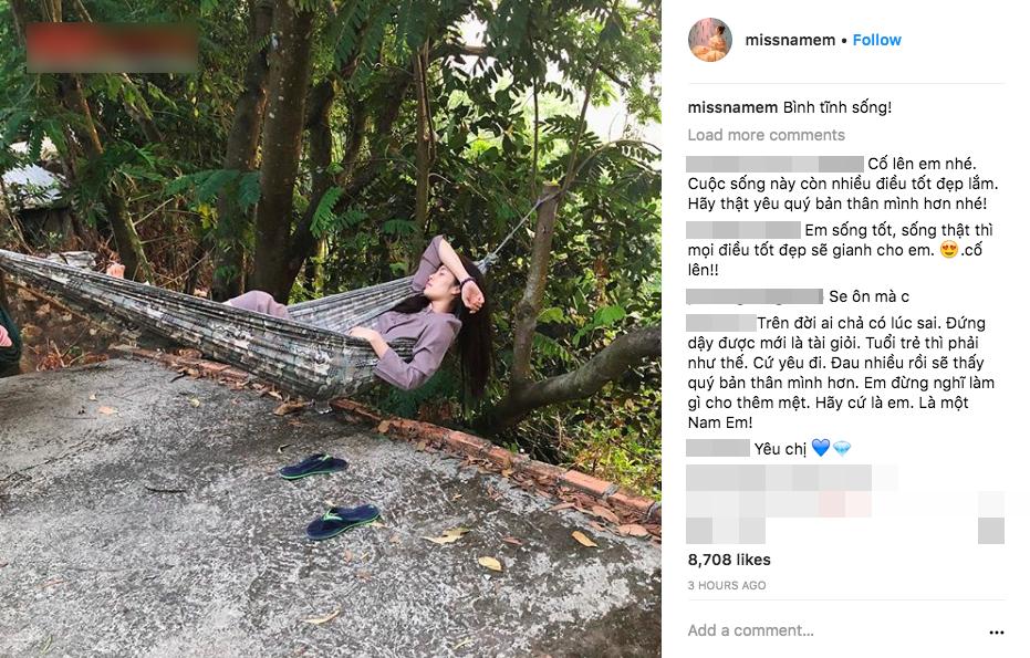 Dòng trạng thái mới nhất của Hoa khôi Đồng bằng sông Cửu Long 2015 thu hút sự chú ý của người hâm mộ. Nhiều khán giả cho rằng, câu nói "bình tĩnh sống" của Nam Em giữa scandal được xem là lời dặn lòng của cô trước mọi sóng gió cuộc đời.