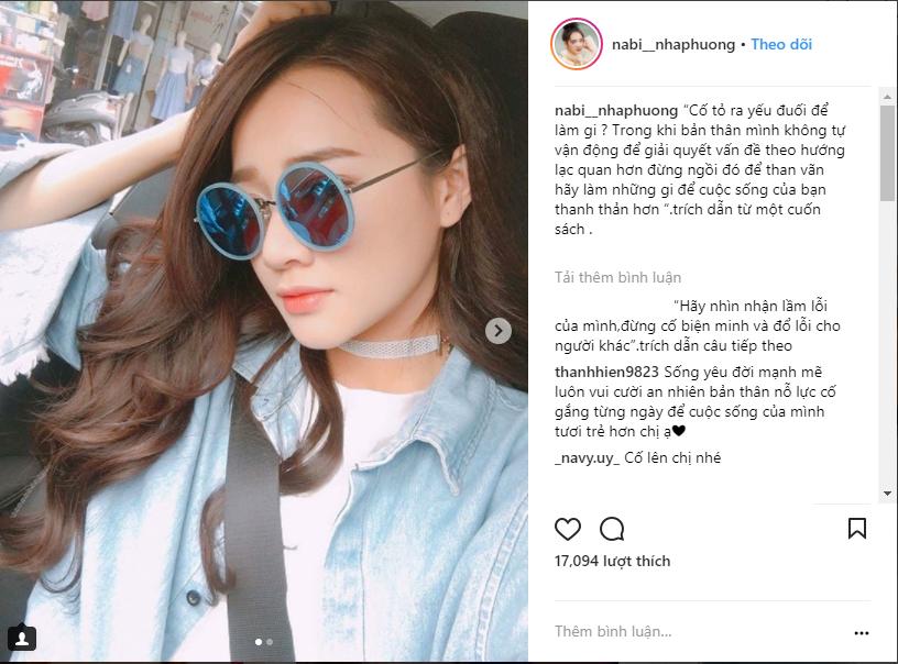 "Cố tỏ ra yếu đuối để làm trong khi bản thân mình không tự vận động để giải quyết vấn đề theo hướng lạc quan hơn, đừng ngồi đó để than vãn. Hãy làm những gì để cuộc sống của bạn thanh thản hơn, trích dẫn từ một cuốn sách", tài khoản Instagram mang tên Nhã Phương viết.
