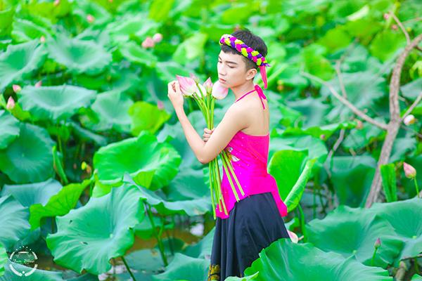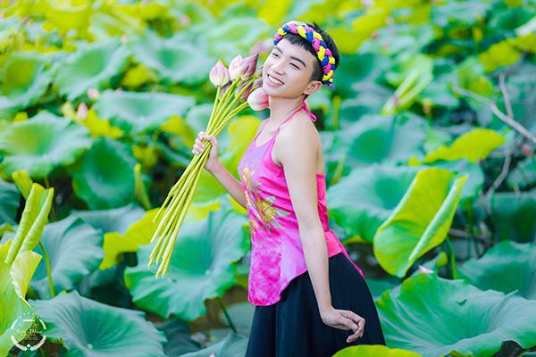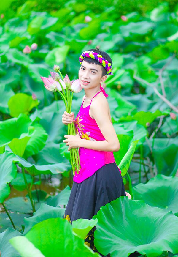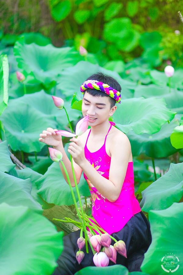Nam sinh Nghệ An mặc áo yếm, chụp hình bên sen.