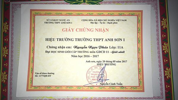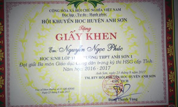 Giấy khen học sinh giỏi môn Giáo dục Công dân cấp tỉnh. Ảnh: NVCC.