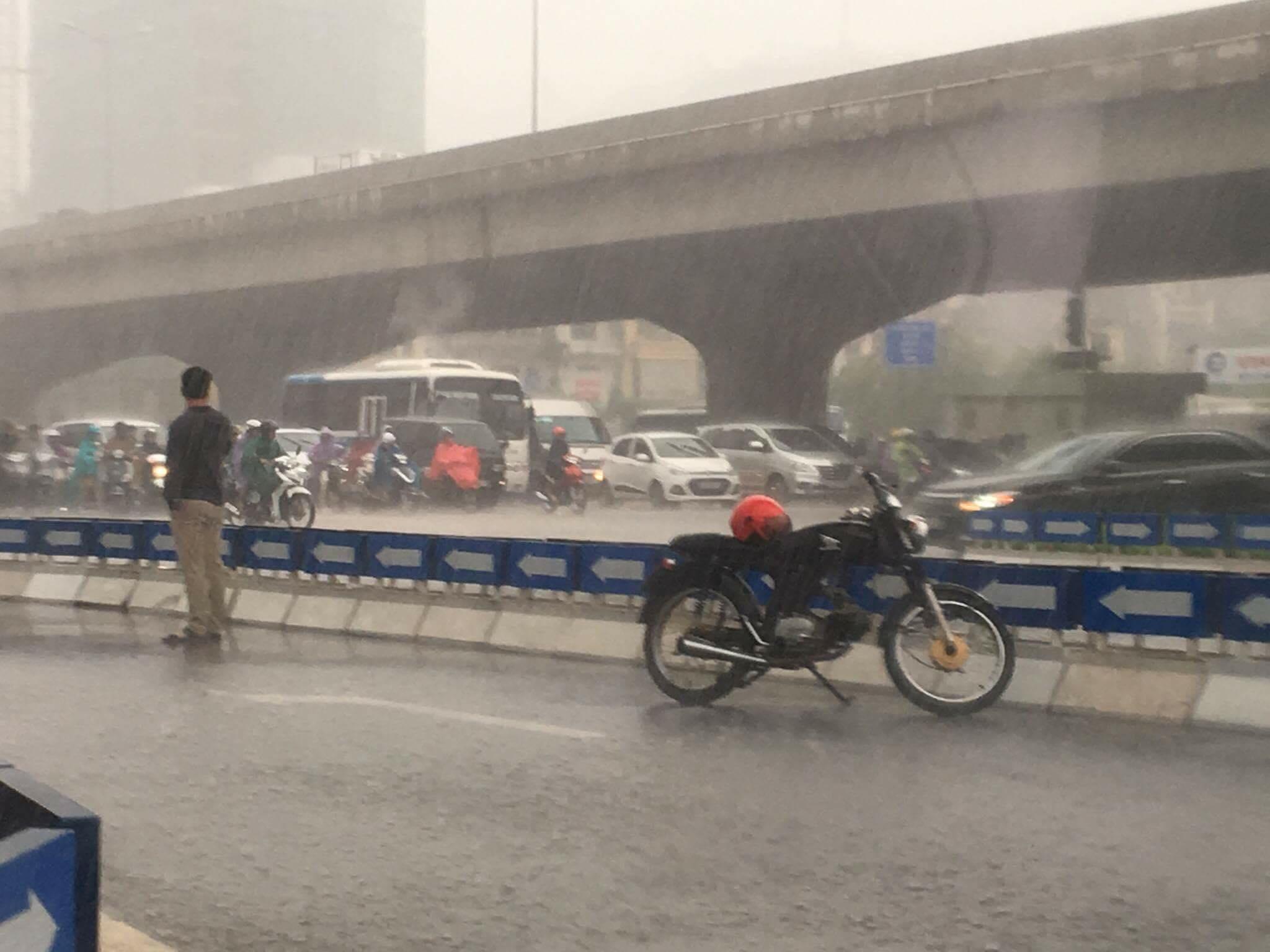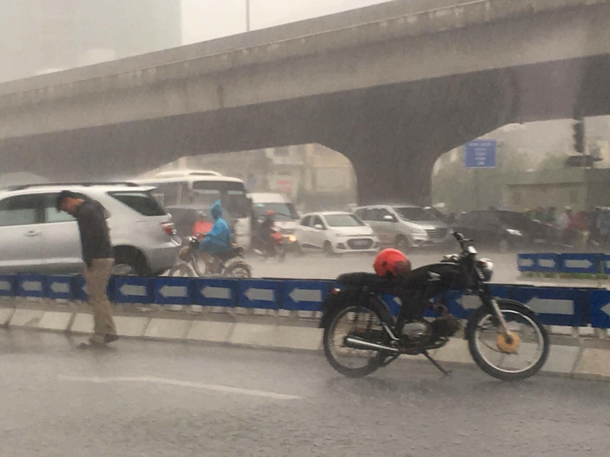 Ảnh gốc nam thanh niên đứng dưới mưa tầm tã với một tâm trạng u buồn vào buổi sáng hôm nay trên đường Khuất Duy Tiến.