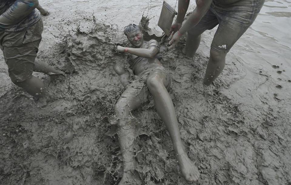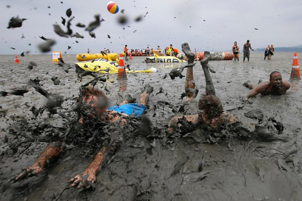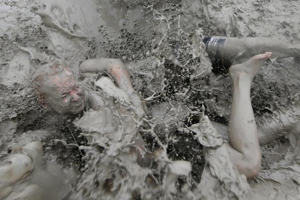 Mọi hoạt động vui chơi diễn ra trong lễ hội đều liên quan đến bùn, từ kéo co, vật lộn, chơi bóng chuyền, trượt... Ảnh: AFP