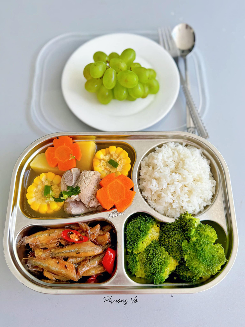 “Mỗi khay ăn, mẹ tôi thường ưu tiên đủ đạm, tinh bột, củ quả hầm để tăng dinh dưỡng. Còn lại, các món rau khác mẹ luộc cho tôi ăn đỡ ngấy”, Phương nói.