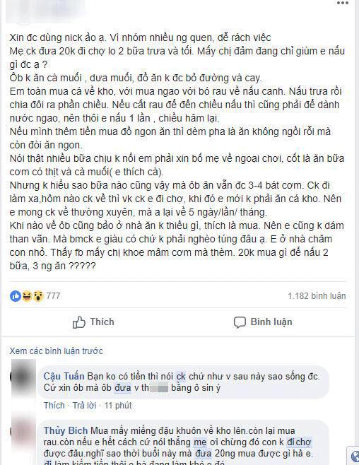 Theo nàng dâu cho biết, vì chồng đi làm xa nhà, sau khi cưới về, cô nàng sống chung với bố mẹ chồng và đảm nhận chuyện chợ búa, cơm canh trong gia đình. Tuy nhiên có lẽ vì thói quen chi tiêu tiết kiệm từ xưa, thêm vào đó là ít đi chợ, không nắm rõ giá cả leo thang nên mẹ chồng cô gái trẻ chỉ đưa cho con dâu đúng 20 nghìn mỗi ngày để đi chợ 2 bữa trưa, tối cho 3 người ăn.