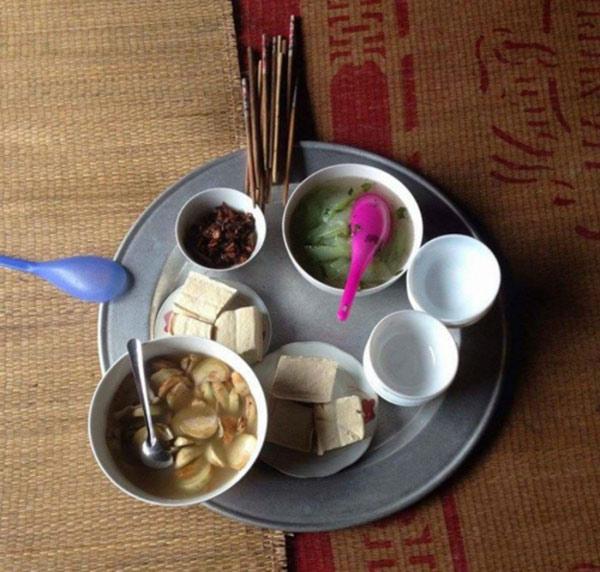 Ngày 1: 6 nghìn đậu rán chấm mắm tỏi, 6k nghìn lạc chao dầu rim mắm, 5 nghìn ngao hoặc hến, 3 nghìn rau.