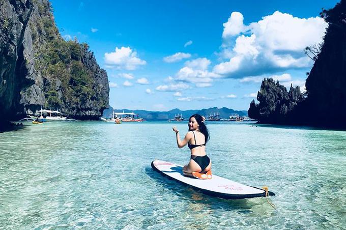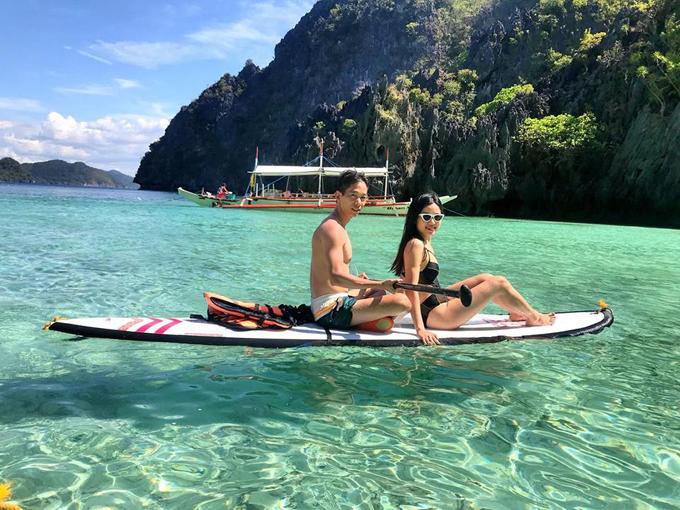 Trong đó, Huyền Thu và ông xã ấn tượng nhất với vẻ đẹp mỹ lệ của Big Lagoon. "Big Lagoon đẹp không từ nào tả xiết. Khi đi tour A, bạn nhớ yêu cầu được đến điểm này sớm và chơi lâu ở đây, thuê kayak 500 peso (khoảng 250.000 đồng) hoặc sup 800 peso (khoảng 400.000 đồng) để chèo vào sâu bên trong ngắm cảnh đẹp nhé. Điểm bắt đầu của Big Lagoon là một đoạn nước nông giữa 2 khe núi, trong vắt nhìn xuyên đáy. Điều mình thích nhất ở đoạn này là nước chỉ ngập từ ngang đầu gối đến ngang ngực, tha hồ làm đủ trò mà không sợ kể cả không biết bơi", Huyền Thu kể.