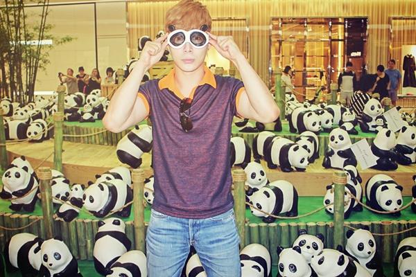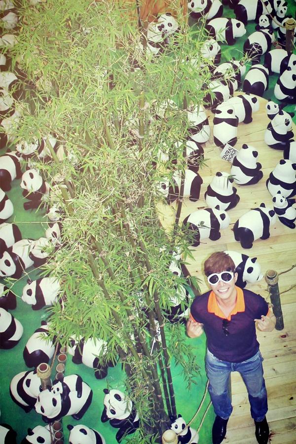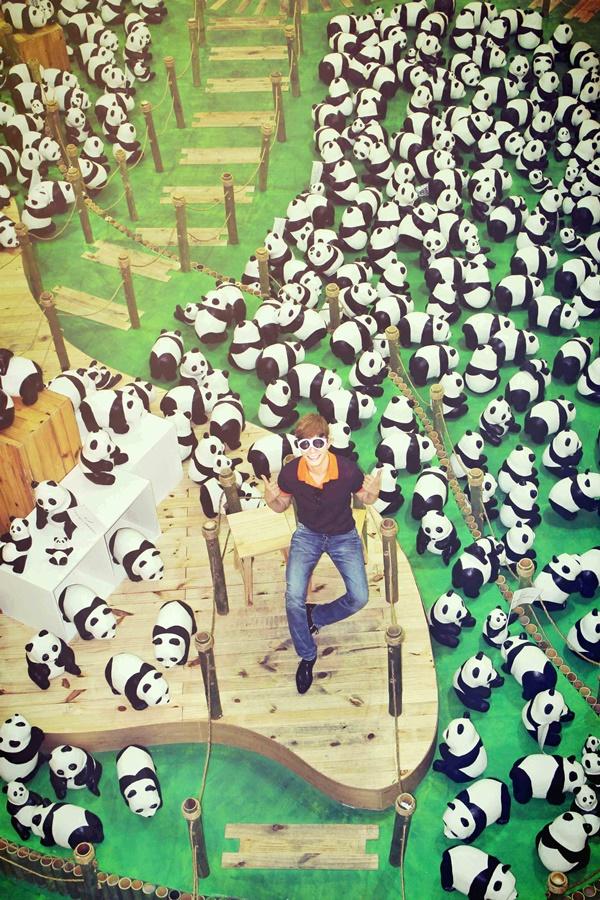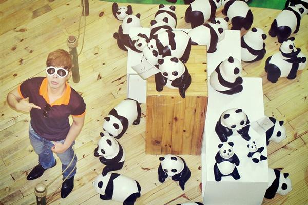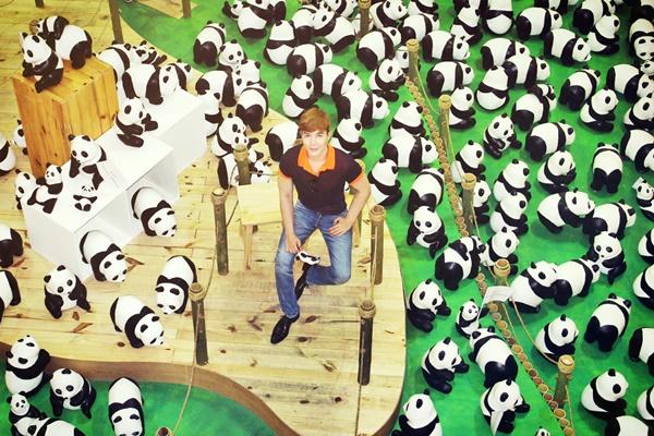 Anh chàng rất thích thú khi tạo dáng với những chú gấu trúc xinh xắn