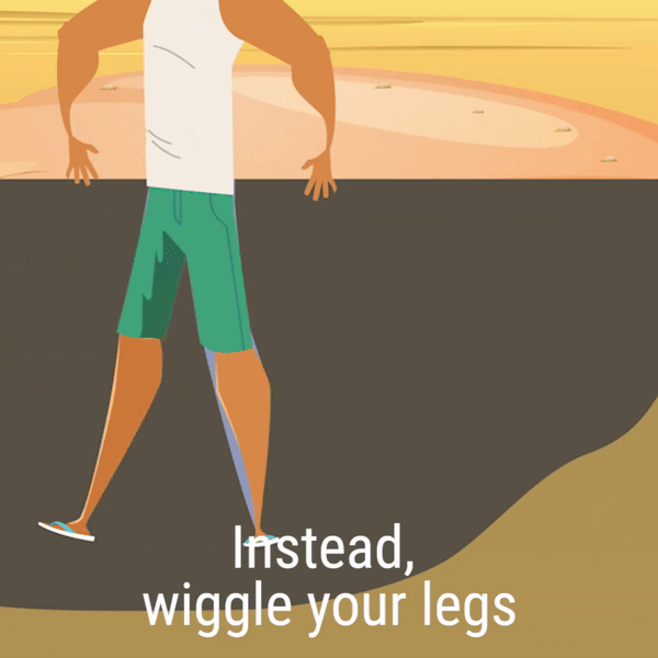 Đầu tiên, bạn hãy lắc hai chân liên tục trong vùng cát mà bạn bị lún, nhằm tạo ra một khoảng không vừa đủ cho nước biển tràn vào. Vùng cát xung quanh bạn cũng vì thế mà được nới lỏng.