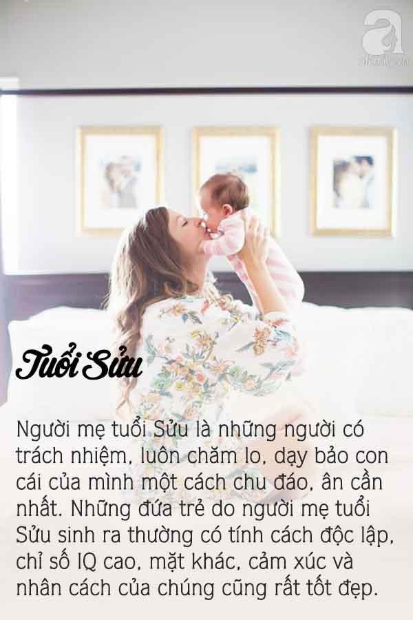 Người mẹ tuổi Sửu là những người có trách nhiệm, luôn chăm lo, dạy bảo con cái của mình một cách chu đáo, ân cần nhất. Họ hướng đến trẻ những điều tốt đẹp và đúng đắn. Những đứa trẻ do người mẹ tuổi Sửu sinh ra thường có tính cách độc lập, chỉ số IQ cao, mặt khác, cảm xúc và nhân cách của chúng cũng rất tốt đẹp.