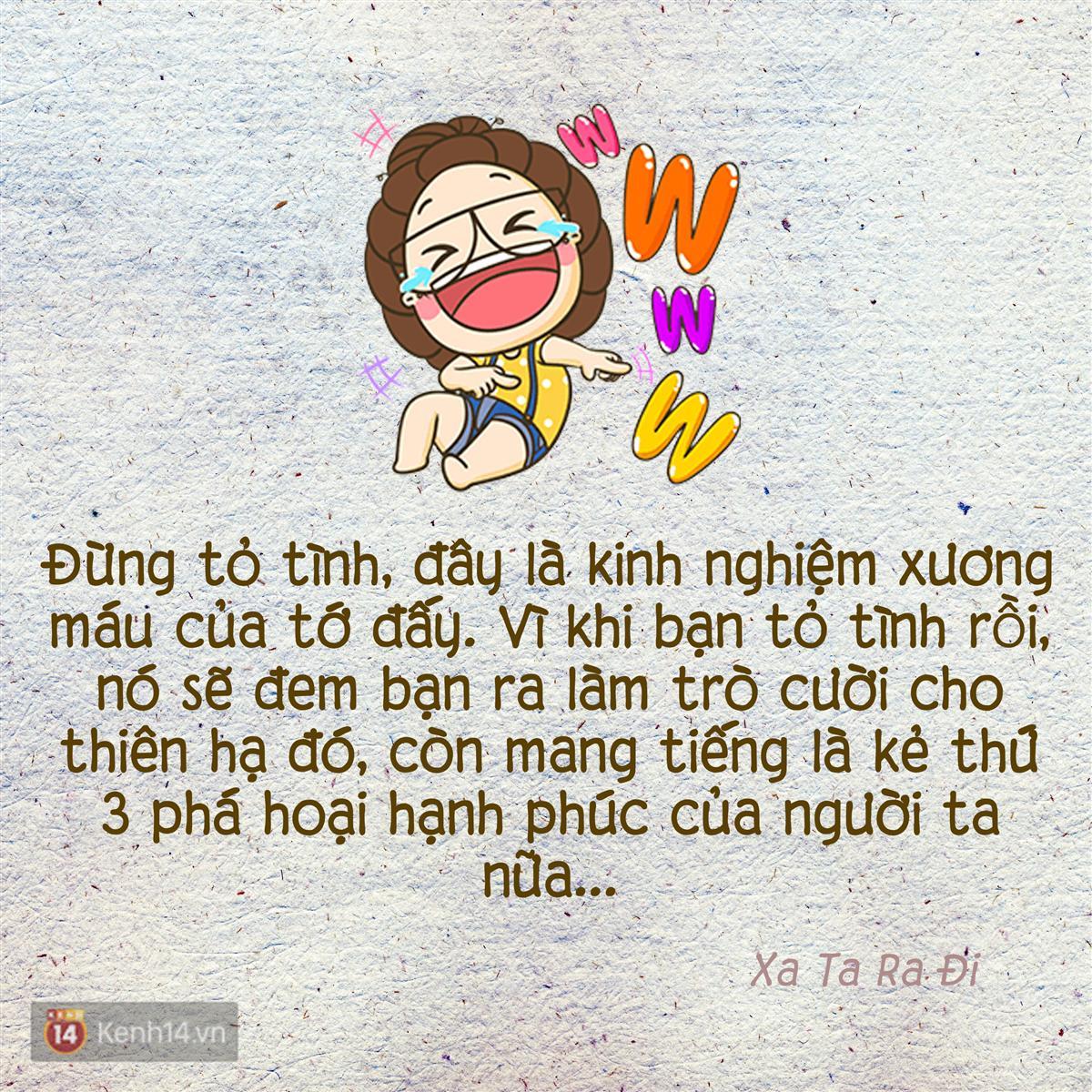 10. Đừng tỏ tình, đây là kinh nghiệm xương máu của tớ đấy. Vì khi bạn tỏ tình rồi, nó sẽ đem bạn ra làm trò cười cho thiên hạ đó, còn mang tiếng là kẻ thứ 3 phá hoại hạnh phúc của người ta nữa... (Xa Ta Ra Đi)