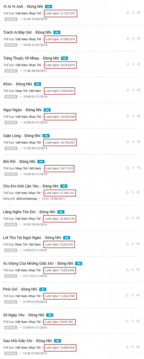 Gương mặt cuối cùng có mặt trong danh sách này chính là Đông Nhi. Mặc dù có thể yếu thế hơn các đồng nghiệp nam một chút nhưng về phía nữ thì cô nàng hiện đang là nghệ sĩ hiếm hoi giữ được phong độ ổn định cùng tần suất phát hành sản phẩm mới đều đặn. Các ca khúc gần đây của Đông Nhi như Còn nơi đó chờ em, Xin anh đừng đều có thứ hạng cao trên các trang nghe nhạc online.