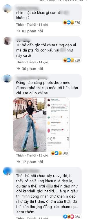 Bài đăng của Nga Nguyễn nhanh chóng thu hút sự chú ý của cư dân mạng. Phía dưới ảnh rất nhiều bình luận chê bai: "Đằng nào cũng photoshop méo đường phố thì cho méo tới bến đi chị", "Chưa thấy ai photoshop mà vẫn xấu thế", "Sao đường phố biến dạng thế nhỉ? Chị photoshop quá đà rồi chị ơi", "Có vẻ chị không tự tin vào bản thân hay sao đó mà bóp méo hết tất cả mọi thứ vậy nhỉ?", ...