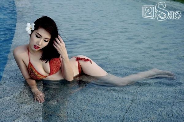 Á Hậu Trang sức Lê Huỳnh Thúy Ngân khoe vóc dáng ngọt ngào trong trang phục bikini với chất liệu len được đan bằng tay do nhà thiết kế thân thiết - Việt Hùng làm riêng cho cô. Trong bộ ảnh chào đón hè này, Thúy Ngân có cơ hội khoe ba vòng mướt mắt và tạo dáng gợi cảm bên bể bơi "đẩy lùi" cái nắng oi ả của Miền Nam.