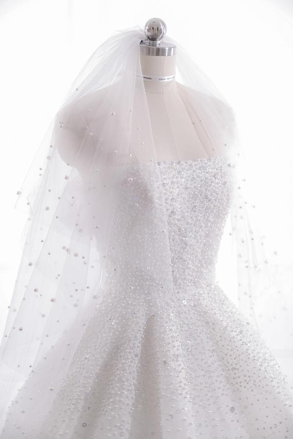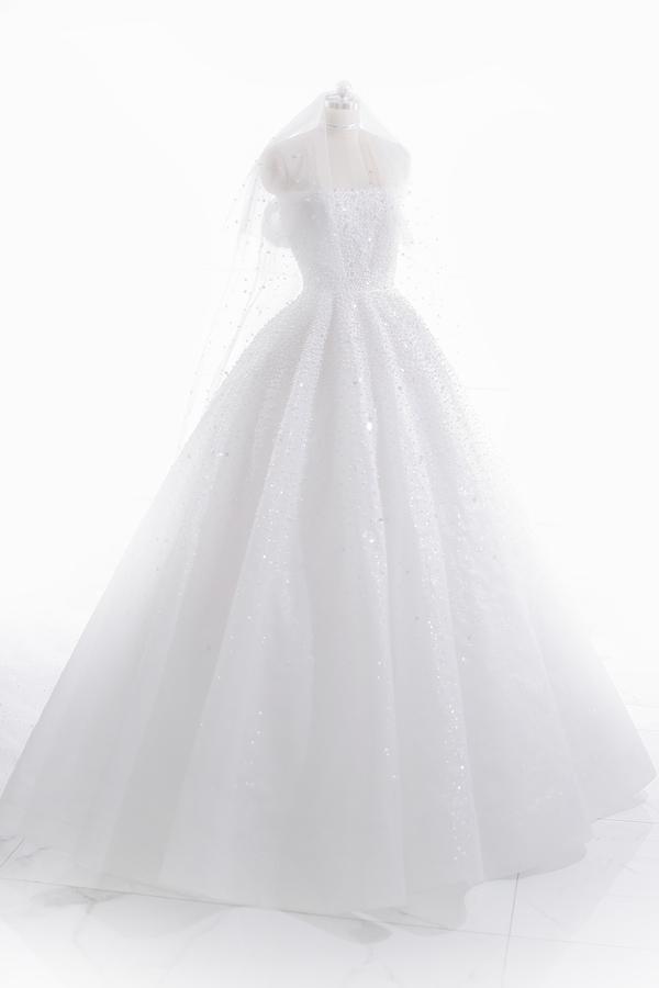 Lấy ý tưởng từ nàng công chúa bước ra từ cổ tích, bộ váy cưới xa hoa của Tú Anh được thiết kế theo phom dáng xòe phồng tạo sự bồng bềnh, sang trọng với phần họa tiết được đính hơn 20.000 viên pha lê và loại đá Swarovski tỉ mỉ bằng tay.
