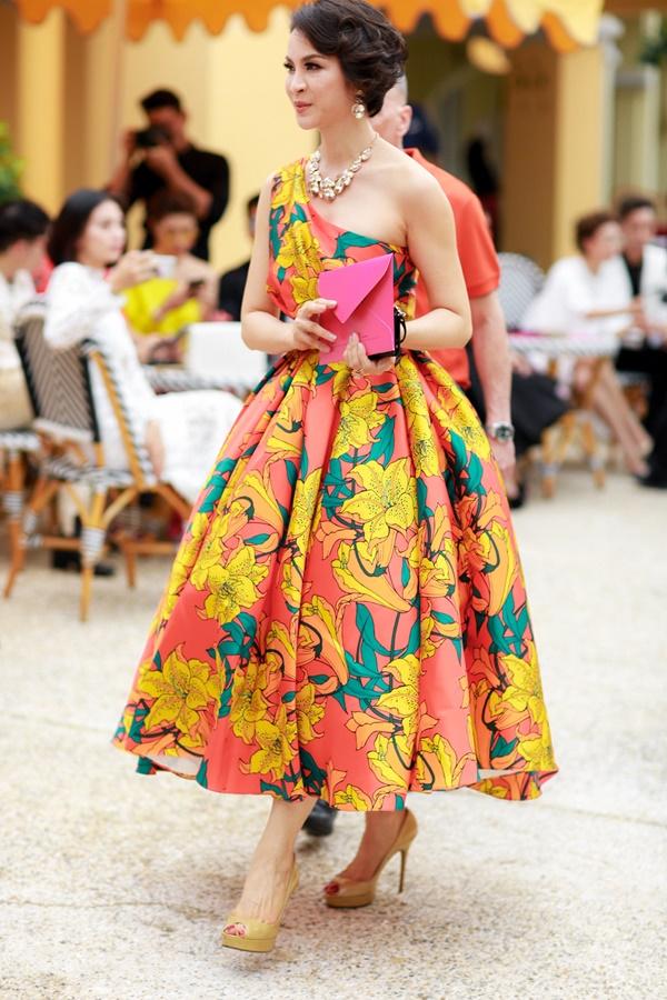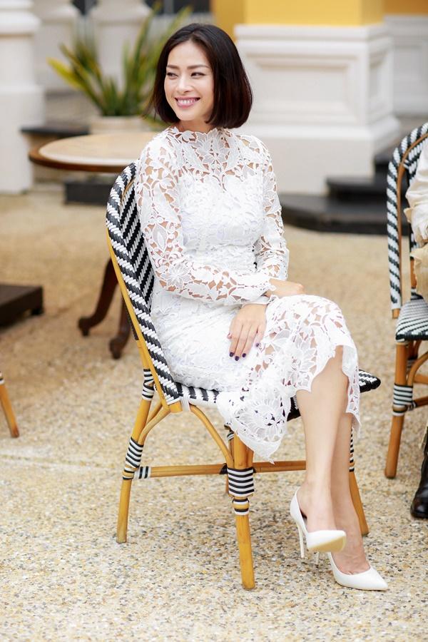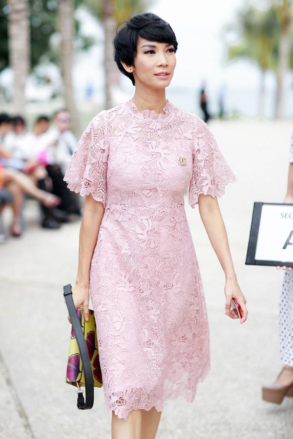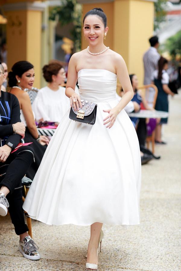 Ngô Thanh Vân là một trong những ngôi sao đến sớm nhất để chờ đón show diễn. Cô lựa chọn trang phục thanh lịch, đơn giản với váy bodycon ôm sát màu trắng, điểm xuyết hoạ tiết hoa ly, sắc hoa chủ đạo trong bộ sưu tập xuân hè 2017 của Đỗ Mạnh Cường.