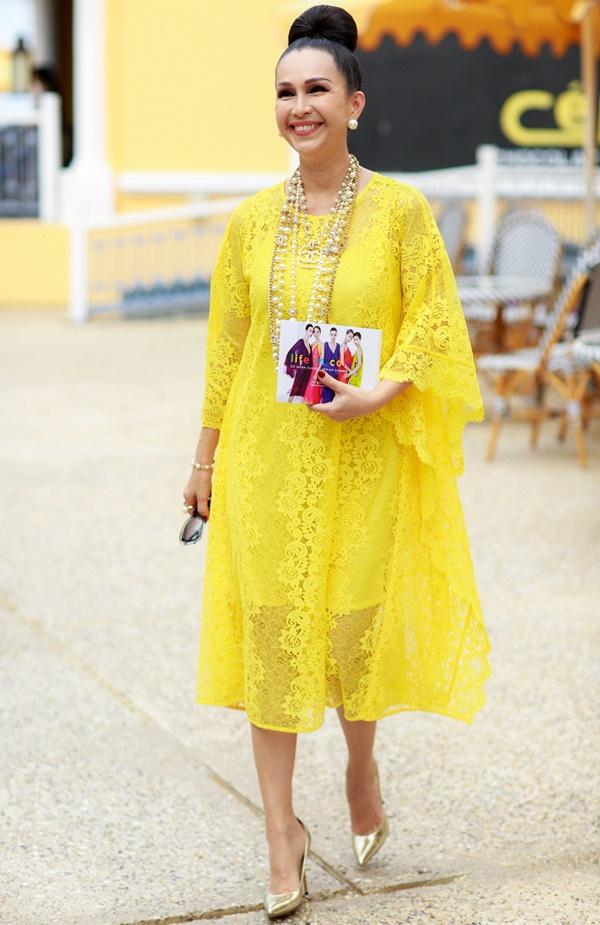 Người mẫu Thu Hằng chọn diện áo đơn sắc màu vàng lệch vai kết hợp quần loe rộng hoạ tiết hoa ly. Tinh thần đơn giản, sang trọng giúp cô tỏa sáng tuyệt đối.