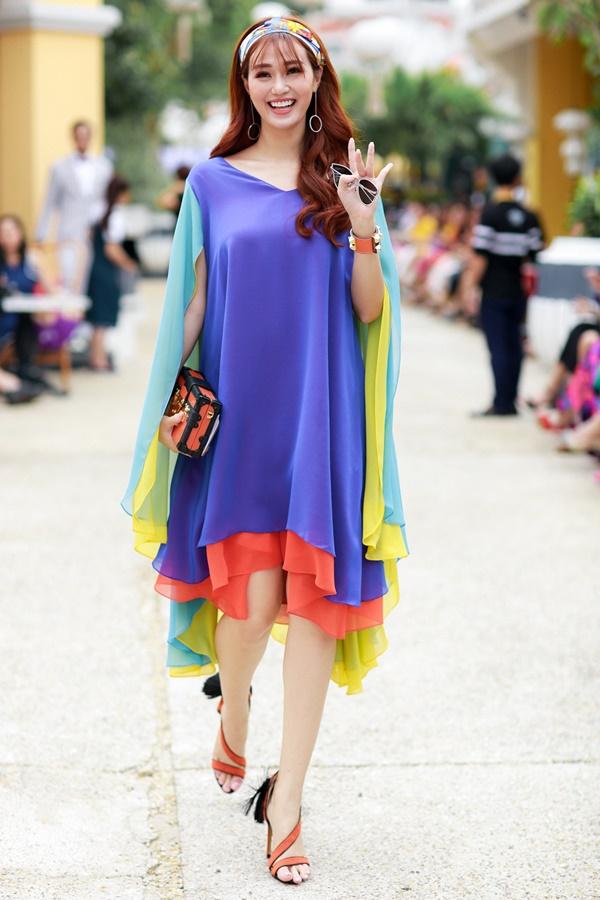Khánh My diện trang phục thực hiện trên nền chất liệu voan lụa mềm mại, với phom xoè ngang gối, kết hợp nhiều tông màu rực rỡ.