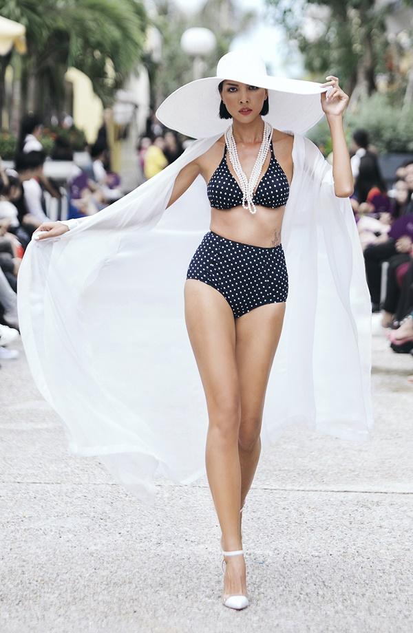 Minh Triệu là người mẫu mở màn cho show diễn với bộ trang phục tắm vô cùng gợi cảm kết hợp áo choàng dài, mũ rộng vành đậm chất mùa hạ của vùng biển.