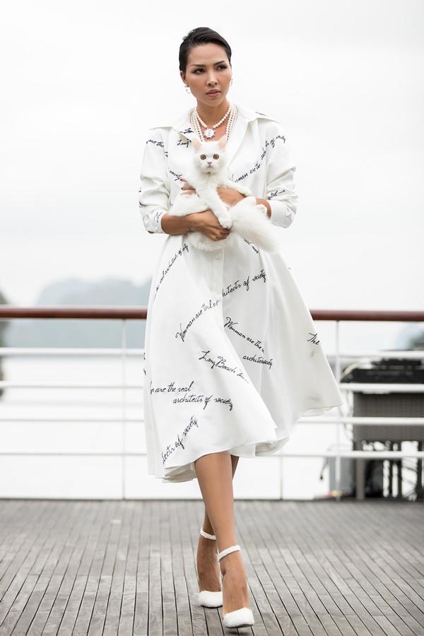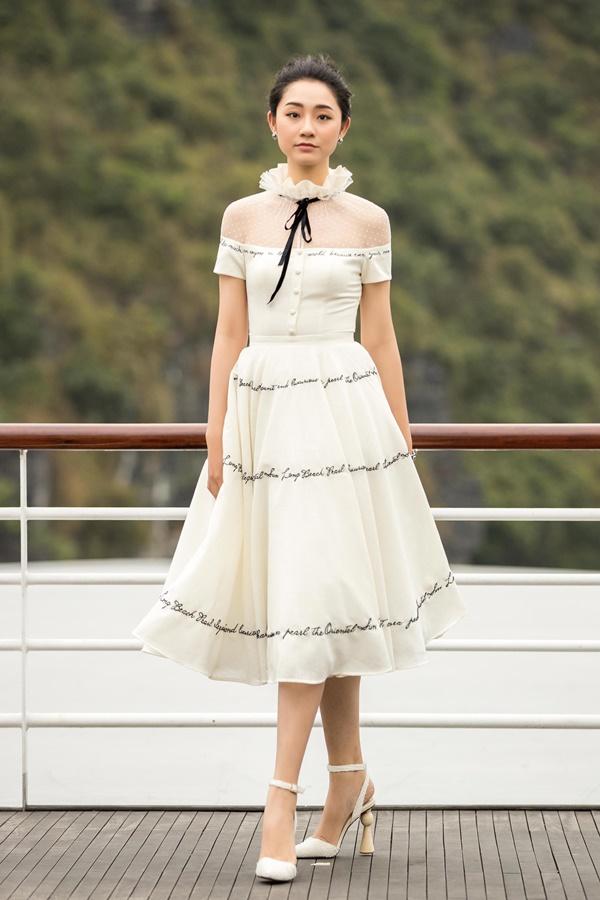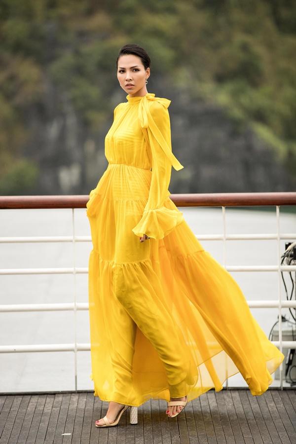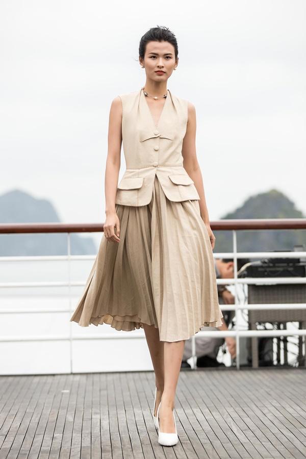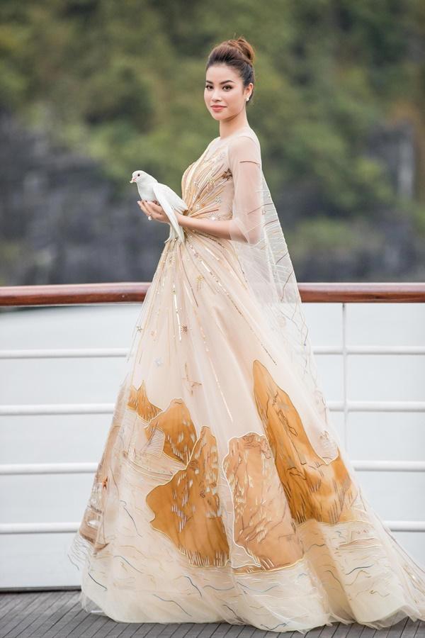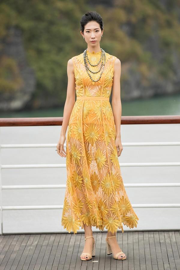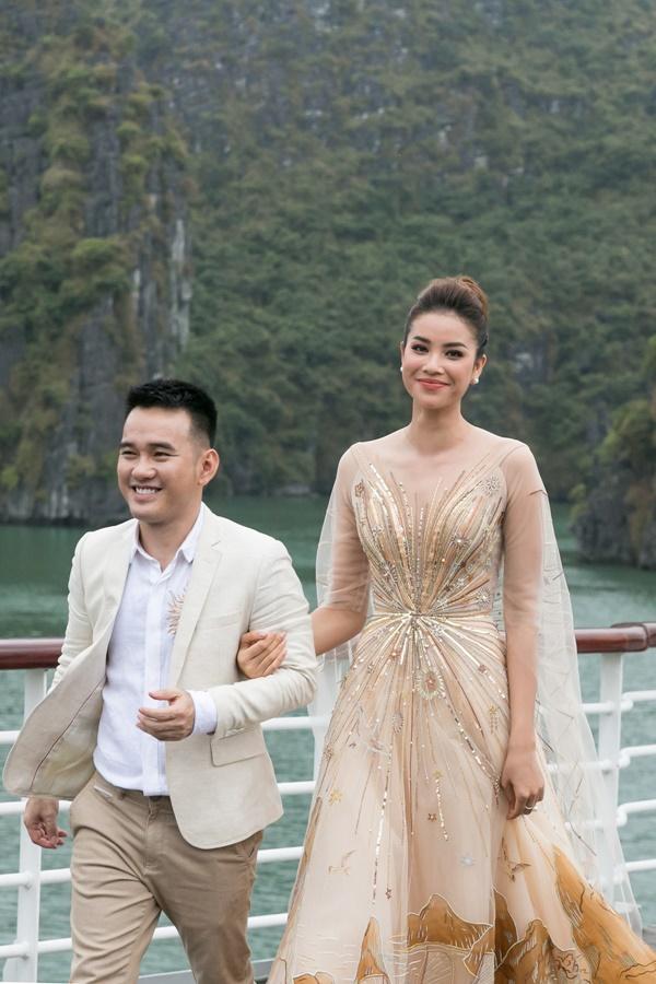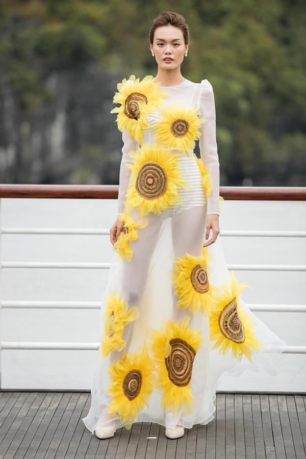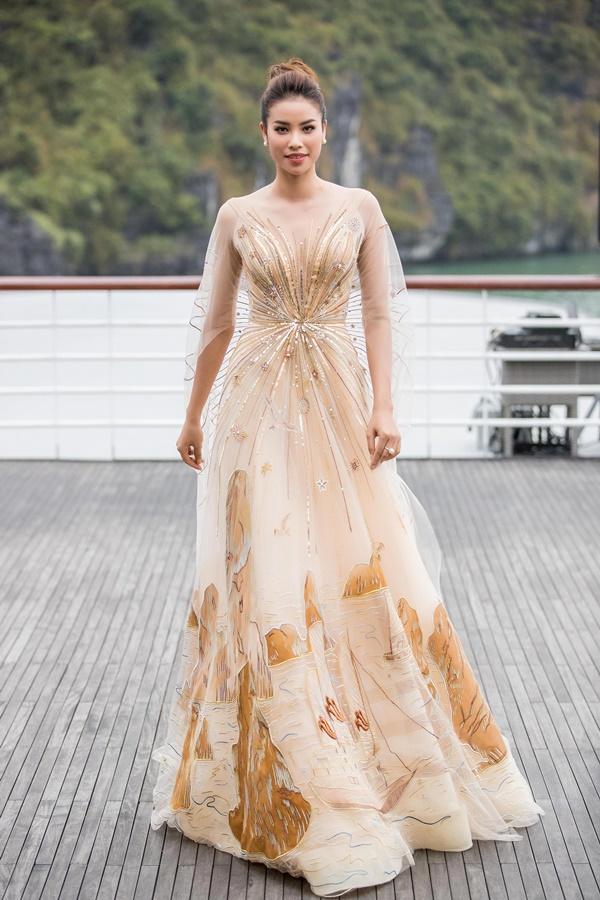 Trong không gian hùng vĩ lãng mạn của biển trời Hạ Long, 52 mẫu thiết kế của BST Mặt trời phương Đông của NTK Lê Thanh Hòa khiến người xem phải trầm trồ. Đảm nhiệm vai trò veddett, Phạm Hương xuất hiện kiêu sa, sang chảnh và tự tin sải bước với thần thái chuẩn hoa hậu, khiến người xem hết lời khen ngợi.
