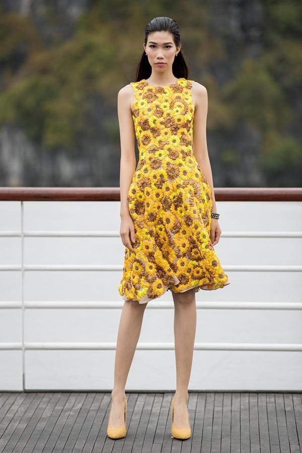 Sử dụng sắc trắng - vàng- kem nhẹ nhàng, các thiết kế của Mặt trời phương Đông thanh lịch, nhẹ nhàng tinh tế song vẫn ẩn chứa sự mạnh mẽ, cá tính không kém phần hiện đại khi khai thác triệt để form dáng cổ điển như đầm petlum, đầm xoè qua gối, cut-out... cầu kì và tinh tế.