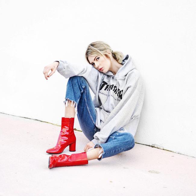 Đôi boots da bóng màu đỏ cực sexy đã trở thành điểm nhấn bất ngờ nhưng lại tuyệt đối ưng mắt cho set đồ