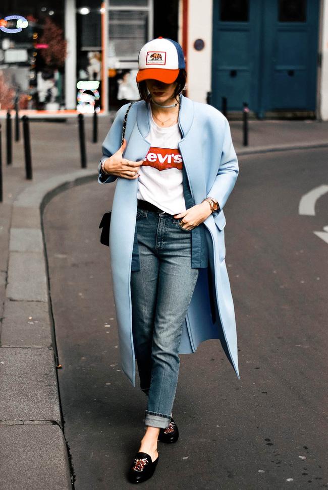 Công thức diện áo dạ dáng dài đảm bảo "chất" chính là mix cùng áo phông họa tiết, quần jeans và mũ lưỡi trai.