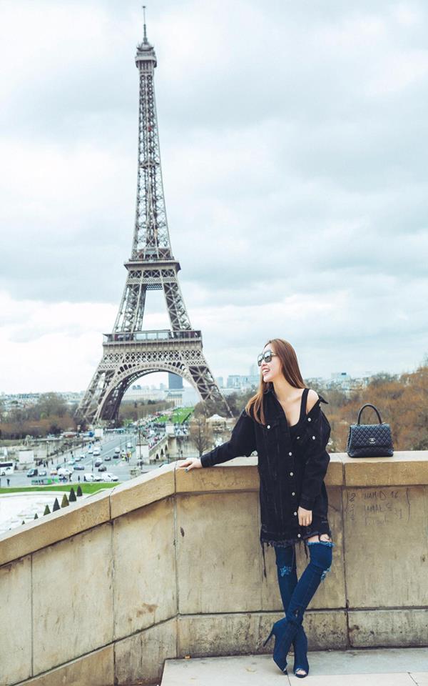 Bộ denim của Quỳnh Thư trở nên siêu sexy khi kết hợp với boot denim cao, hở mũi.