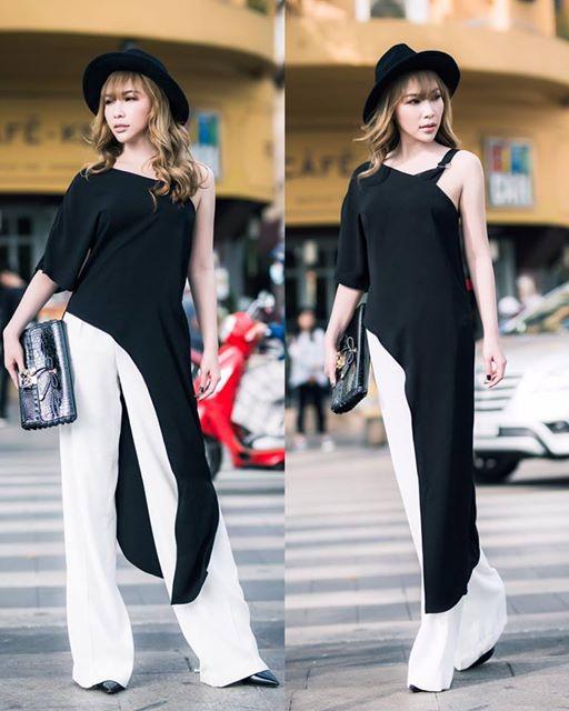 Một cách kết hợp khác biệt nữa của Quỳnh Thư khi diện áo phông đen in chữ vàng, sự kết hợp an toàn của tông đen - vàng ánh. Với quần bó ống xòe, xẻ tà nhẹ cùng túi Chanel Black Coco Handle, cô nàng sải bước trên phố với phong thái vừa quyến rũ lại không kém phần năng động trẻ trung.