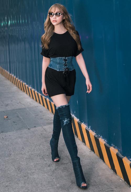 Corset - loại trang phục ra đời cách đây hơn 4000 năm. Với sự kết hợp ăn ý giữa tông đen và corset denim, Quỳnh Thư khiến vẻ đẹp và sự gợi cảm của corset vẫn giữ nguyên giá trị ban đầu.