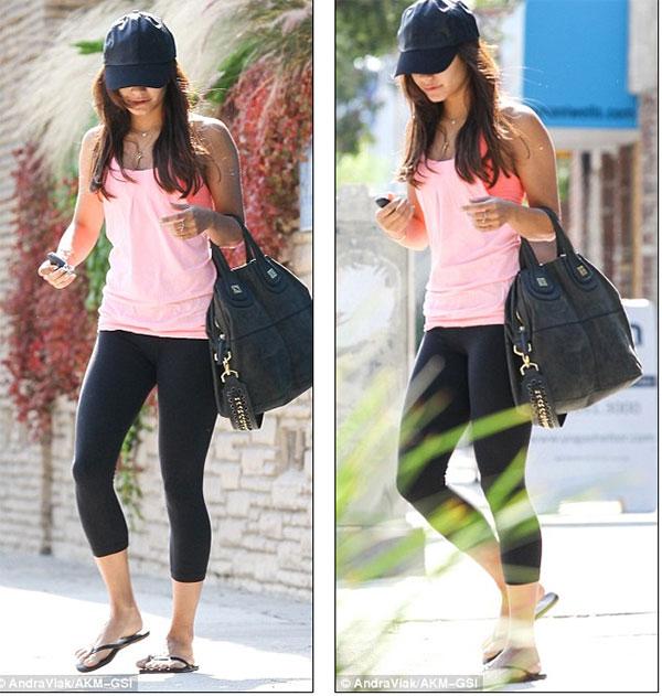 Quần ngố bó sát kết hợp áo ba lỗ hồng, dép xỏ ngón, mũ lưỡi trai và túi xách to bản phối
