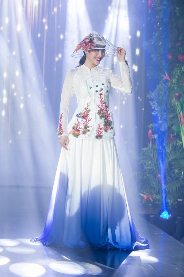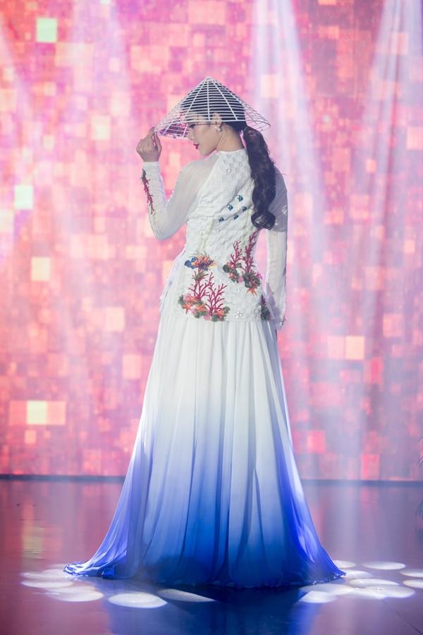 Trên nền vải lụa rép sang trọng, những người thợ thêu tay tỉ mỉ thêu với nhiều cách thức khác nhau để tạo nên hình ảnh đại dương sống bởi những rạn san hô, những đàn cá,... hết sức sinh động và huyền bí. Hình ảnh chiếc áo dài dân tộc mang thông điệp đầy ý nghĩa “Bảo vệ Trái đất là bảo vệ chúng ta” sẽ được truyền tải đến tất cả mọi người, góp phần kêu gọi cùng chung tay bảo vệ Trái đất.