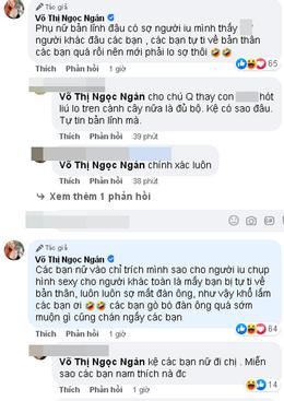 "Các bạn nữ vào chỉ trích mình sao cho người yêu chụp hình sexy cho người khác, toàn là mấy bạn bị tự ti về bản thân, luôn luôn sợ mất đàn ông, như vậy khổ lắm các bạn ơi. Các bạn gò bó đàn ông quá sớm muộn gì cũng chán ngấy các bạn", Ngân 98 nói thêm.