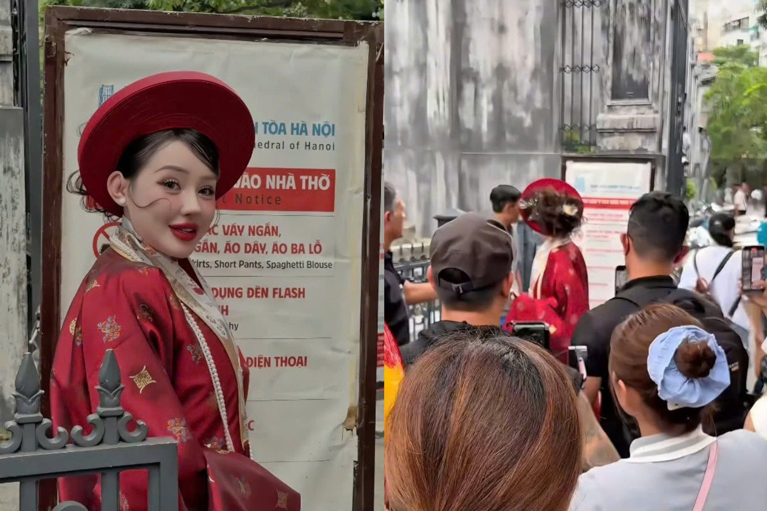 Cụ thể, người đẹp có mặt ở Nhà thờ Lớn để quay phim chụp hình. Cô diện cổ phục màu đỏ, trang điểm nổi bật. Tuy nhiên, trong clip, bà xã Lương Bằng Quang lên tiếng khi bị một số người lạ mặt tới dọa nạt, đuổi đi, thậm chí đòi hành hung.