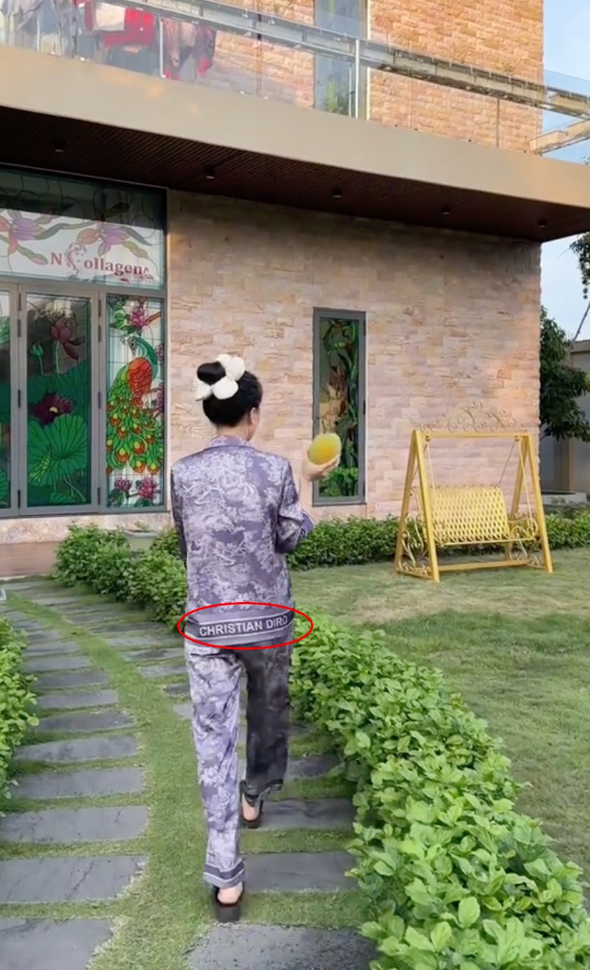 Chưa hết, dân tình cũng không khỏi thắc mắc, Ngân Collagen sống trong biệt thự 500 tỷ, mua hàng hiệu theo lố nhưng sao lại mặc đồ ngủ hàng nhái. Cụ thể, trong một clip quay tại gia, người đẹp diện bộ ngủ lụa nhưng chữ in trên áo lại không phải hàng chính hãng của Dior mà là hàng nhái nên tên thương hiệu bị viết sai thành Christian Diro.