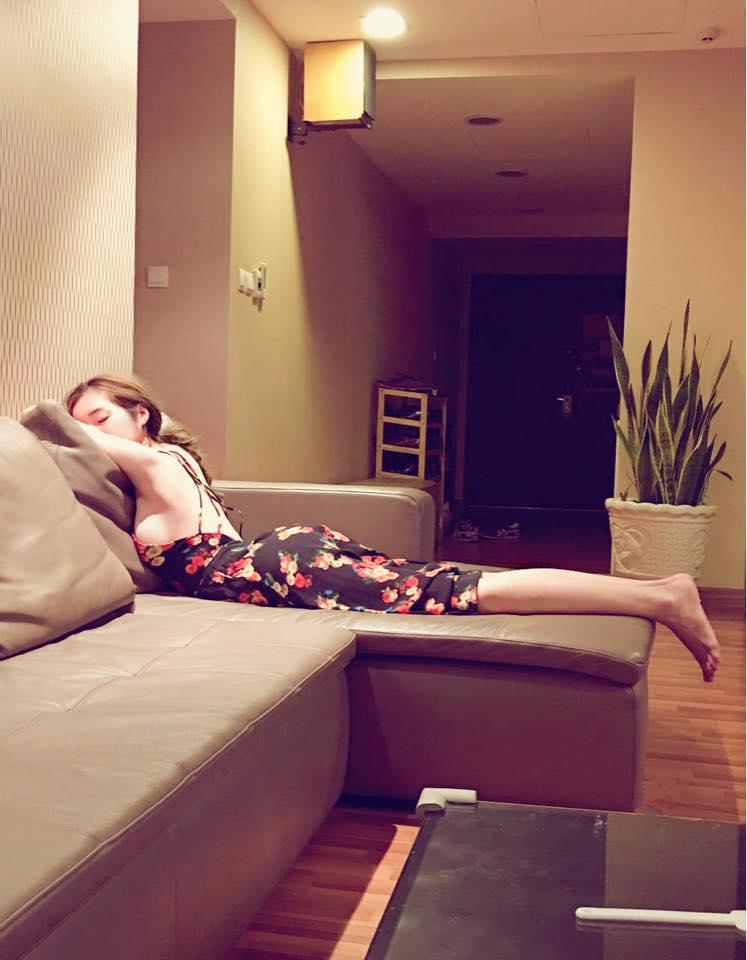 Elly Trần thấm mệt, nằm dài trên ghế sau một ngày làm việc vất vả.